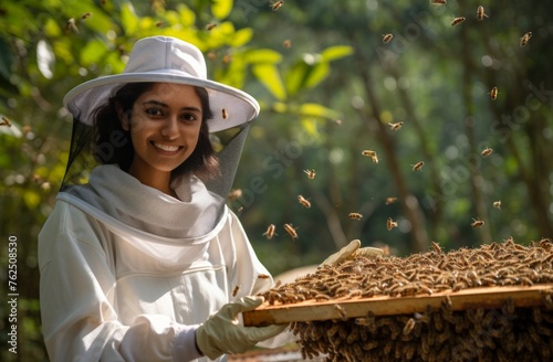 © Darya, Obraz premium Passionate Beekeeper: Woman Enjoying Apiculture