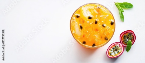 © MetaPixel, Fototapeta premium Passionfruit Drink in Glass with Mint Leaves on White Background Ideal for Beverage Promotion and Copy Space for Text