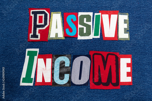 © Natalie Schorr, Fototapeta premium PASSIVE INCOME text word collage colorful fabric on blue denim, side gig, horizontal aspect