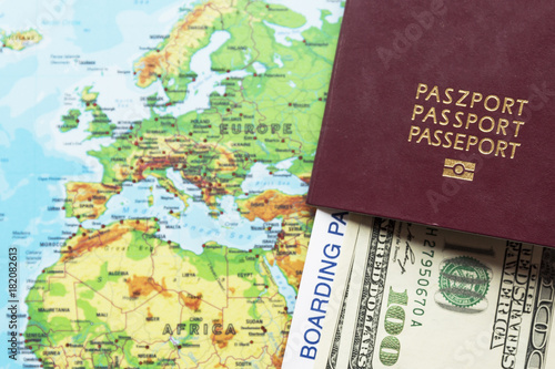 © AnastazjaSoroka, Fototapeta premium Passport on World map background. Money, board pass and sunglasses. Travel concept.