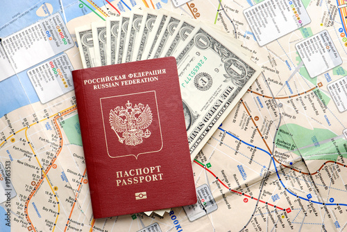 © Dmitriy Kurnyavko, Fototapeta premium passport with the money on a map