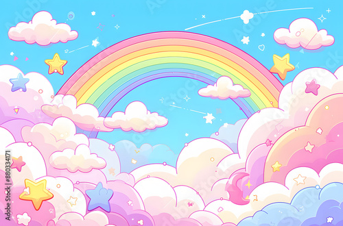 © Sagar, Fototapeta premium pastel background with pink, blue and purple clouds in the sky, rainbow and stars