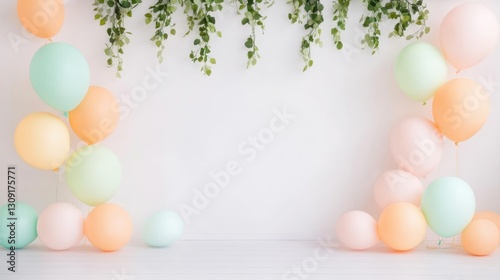 Fototapeta premium Pastel balloons adorning white wall, green vines hanging, creating festive...