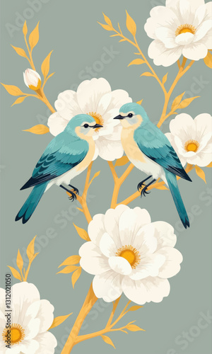 © ArtisticAllure, Obraz premium Pastel birds with blossoms and golden branches