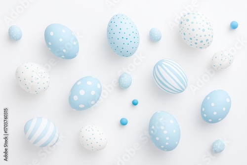 © Yalexai, Fototapeta premium Pastel blue and white decorative eggs with dots and stripes for easter celebrations and spring seasonal decor