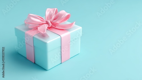 © khumthong, Obraz premium Pastel Blue Gift Box with Pink Ribbon Bow Elegant Present for Birthday Celebration