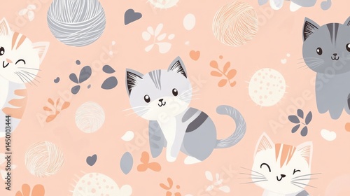 © Anak, Obraz premium Pastel cats and yarn pattern background design.