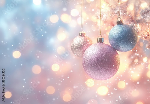 © Enjoy, Fototapeta premium Pastel Christmas Ornaments with Bokeh Lights and Falling Snow