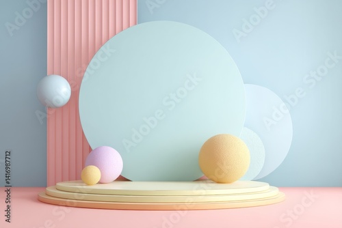 © AndiAzis, Fototapeta premium Pastel Circles and Spheres Showcase Product on Platform Elegantly