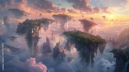 Fototapeta premium Pastel clouds with floating islands waterfalls and lush greenery