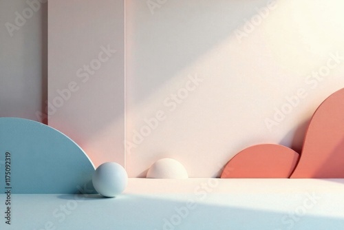 © Mali, Fototapeta premium Pastel-Colored Abstract Shapes and Sphere Composition with Soft Light and Shadow Play on a Minimalist Background