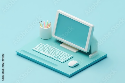 © Andi, Fototapeta premium Pastel-colored computer setup on a light teal background.