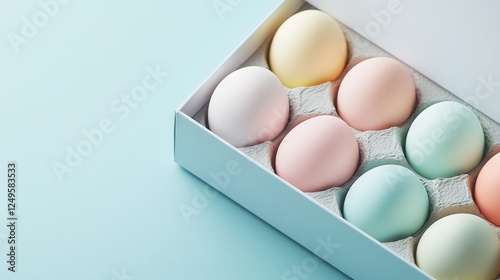 © Olga, Fototapeta premium Pastel-colored egg box on light blue background with space