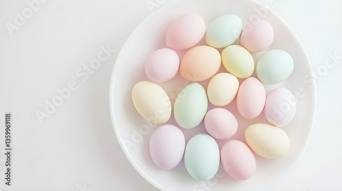 Fototapeta premium Pastel colored eggs arranged on a white plate with soft natural lighting and minimal background. Copy space