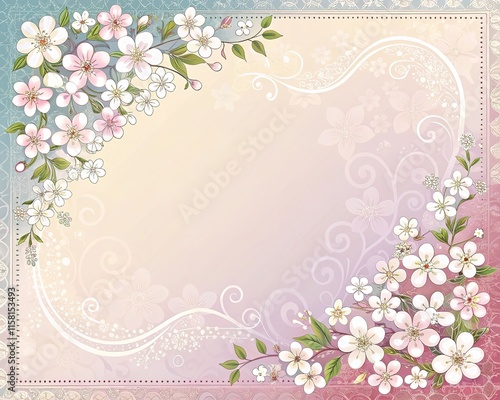 © Thachakrit, Naklejka premium Pastel-colored floral border invitation card design, soft illustration with text space.