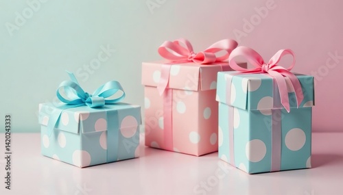 Obraz premium Pastel colored gift boxes with polka dots, whimsical style, illustration,...