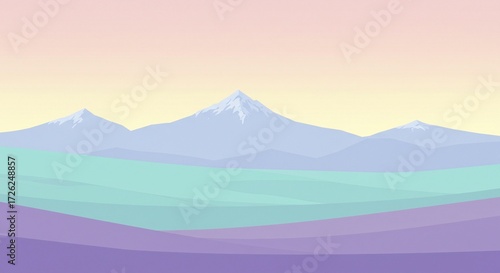 © Cleverson, Naklejka premium Pastel colored mountain range vector with pastel meadow in front of mountains. Vector art, pastel colors, dreamy landscape.