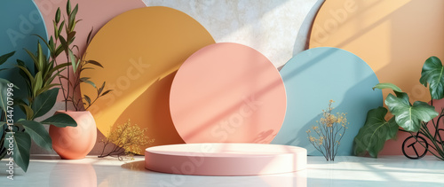 © lina, Fototapeta premium pastel-colored platform with plants for product display