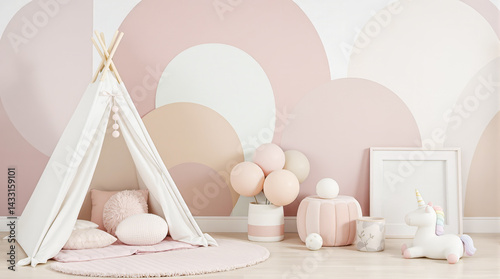 Fototapeta premium pastel-colored playroom with a white teepee pink pillows and an abstract wall