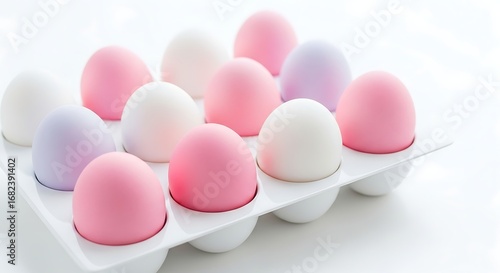 © MdTowhidul, Fototapeta premium Pastel-Colored Smooth Spheres in Tray: A Minimalist Composition with Pink, Purple, and White Tones on a Clean Surface.