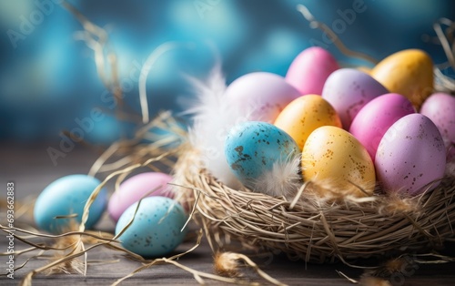 Fototapeta premium Pastel colors easter eggs in the woven basket
