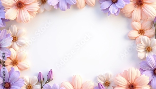 Fototapeta premium Pastel cosmos flowers in soft hues forming a floral frame