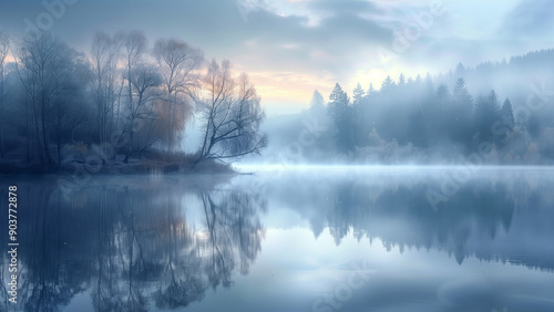 Fototapeta premium “Pastel Dusk: Misty Lake and Trees in Early Evening
