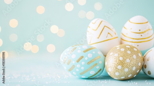 Obraz premium pastel easter background template with gold and light blue eggs featuring...