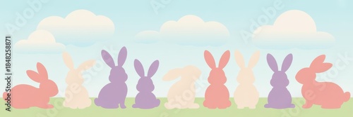 Obraz premium Pastel Easter banner — flat vector 9 bunny silhouettes on grass with copy space