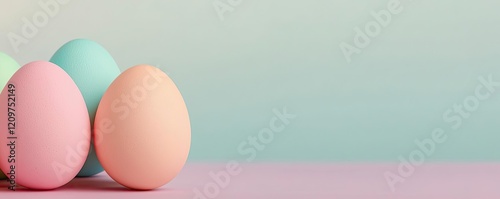 © Thamonchanok, Fototapeta premium Pastel easter concept. Pastel colored eggs arranged on a soft surface, perfect for spring celebrations.
