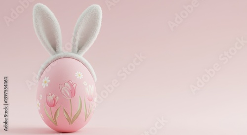 © Nima, Obraz premium Pastel Easter Egg with Bunny Ears - Springtime celebration, Easter bunny, floral design, pink pastel, holiday symbol