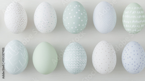 Fototapeta premium Pastel Easter Eggs: A minimalist arrangement of delicate pastel Easter eggs, each with a unique pattern, is a perfect springtime visual for your Easter-themed projects.