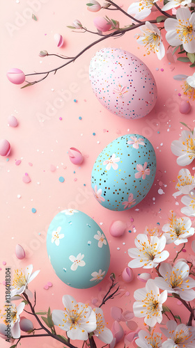 Fototapeta premium Pastel Easter Eggs and Floral Arrangements: Vibrant Seasonal Holiday Decor...