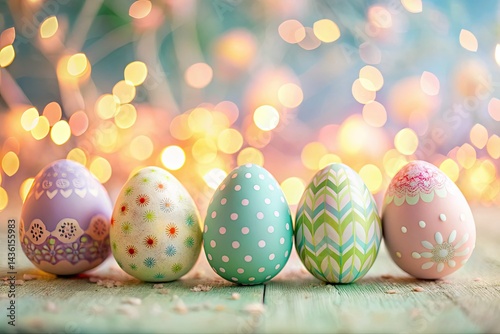 © Chaowarat, Fototapeta premium Pastel Easter Eggs Background, Cute Spring Bokeh, Decorative Egg Pattern, Holiday Image