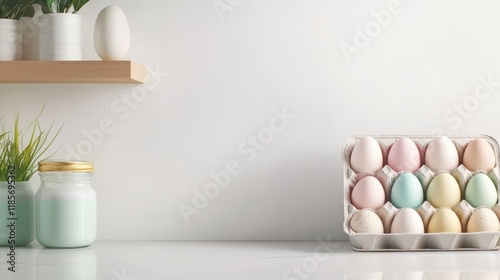 Fototapeta premium Pastel Easter Eggs in Carton: A minimalist kitchen scene featuring a carton...