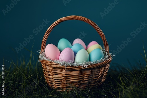 Naklejka premium Pastel Easter Eggs in Wicker Basket on Green Grass Background