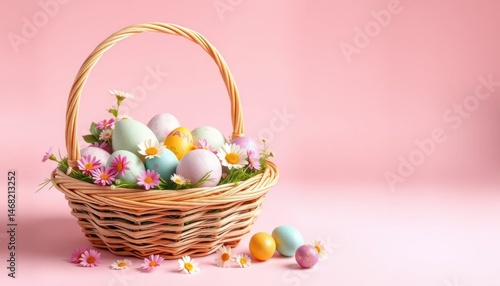 © Restuart, Naklejka premium Pastel Easter Eggs in Wicker Basket with Flowers on Pink Background