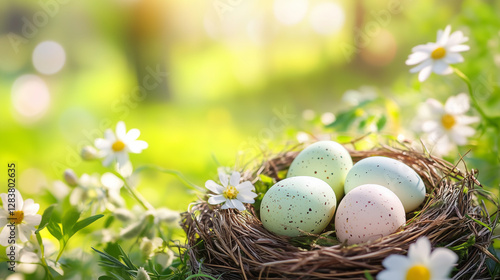 © Jinling, Obraz premium Pastel Easter eggs nestled among spring flowers, radiating warmth and renewal in a serene meadow setting.
