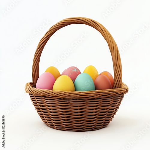 © Por, Naklejka premium Pastel Easter eggs nestled in a woven wicker basket, a springtime celebration of new beginnings and joyful festivities.