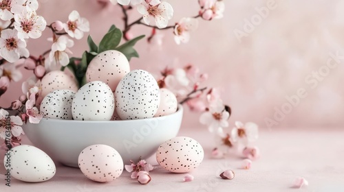 Fototapeta premium Pastel Easter eggs nestled in blossoms, a delicate springtime scene.