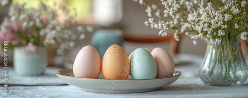 Fototapeta premium Pastel easter eggs with floral decor on table in soft natural light