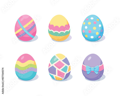 Fototapeta premium Pastel Easter Icons. Pastel Easter eggs. Isometric flat vector icons set of pastel Easter eggs: cross-line patterned Easter egg, scallop band Easter egg,