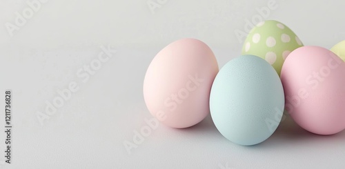 © Jiraporn, Fototapeta premium Pastel easter idea. Colorful pastel Easter eggs arranged on a light background for festive decoration.