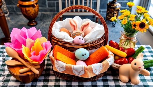 Naklejka premium Pastel Easter Still Life with Bunny Figurines and Decorated Eggs_Description_Easter still life