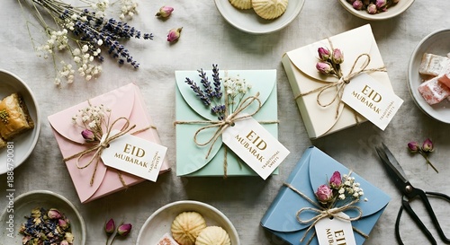 © Rubel, Fototapeta premium Pastel Eid Gift Boxes Flat Lay with Floral Decoration