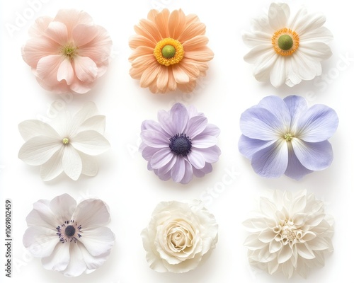 © Whitefeather, Naklejka premium Pastel Floral Arrangement: A delicate and romantic collection of pastel-hued flowers, arranged in a symmetrical grid. Each blossom is a unique work of art.