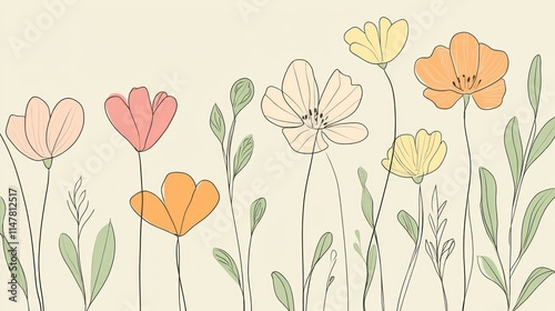 © kucret, Naklejka premium Pastel floral line art illustration.