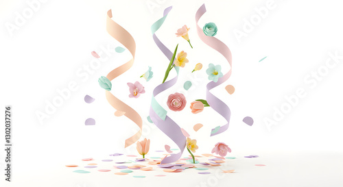 © KingWhite, Fototapeta premium Pastel flowers and confetti celebration spring festive design cute soft on transparent background