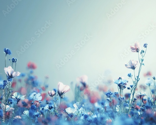 Obraz premium Pastel flowers field, soft light, serene landscape, nature backdrop, perfect...