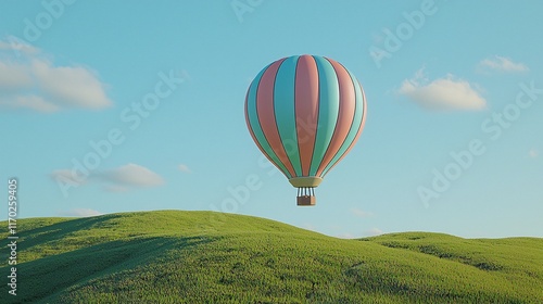 © ZRO, Obraz premium Pastel hot air balloon floats over rolling green hills